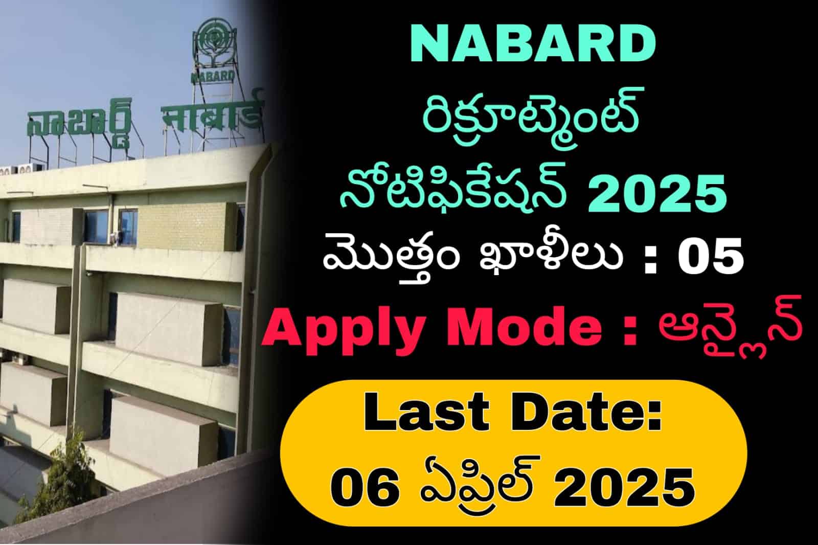 నేషనల్ బ్యాంక్ ఫర్ అగ్రికల్చర్ అండ్ రూరల్ డెవలప్మెంట్ (NABARD) నోటిఫికేషన్ 2025 విడుదల చేసింది. ఆసక్తి గల నిరుద్యోగ అభ్యర్థులు మార్చి 22,2025 నుండి ఆన్లైన్ లో అప్లై చేసుకోవచ్చు. చివరి తేదీ ఏప్రిల్ 06,2025 రాత్రి 11:59 లోపు అప్లికేషన్ వేసుకోవచ్చు.