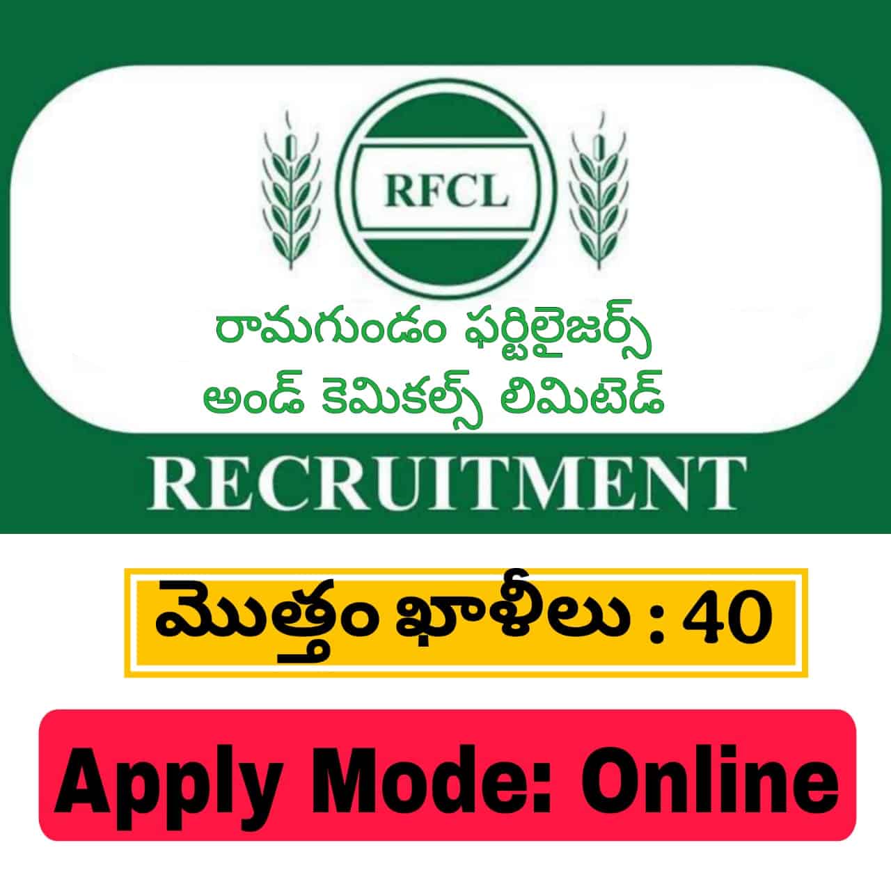రామగుండం ఫర్టిలైజర్స్ అండ్ కెమికల్స్ లిమిటెడ్ (RFCL) 2025 సంవత్సరానికి వివిధ విభాగాలలో 40 ఖాళీలు ఉన్నాయి. ఖాళీలు కోసం భర్తీ ప్రక్రియను ప్రకటించింది. ఫర్టిలైజర్ మరియు కెమికల్ పరిశ్రమలో కెరీర్ కోసం ఆసక్తి ఉన్న అభ్యర్థులు మరియు నిరుద్యోగులు మార్చి 12, 2025 నుండి ఏప్రిల్ 10, 2025 లోపు ఆన్లైన్లో దరఖాస్తు చేసుకోవచ్చు.