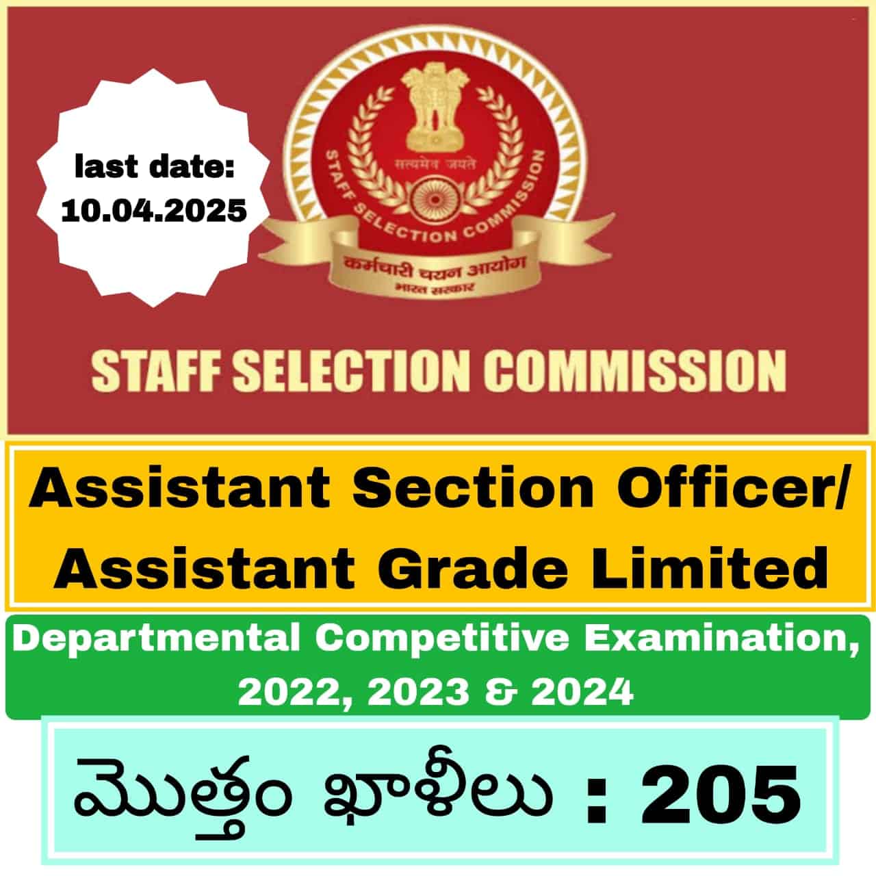 స్టాఫ్ సెలెక్షన్ కమిషన్ (SSC) అసిస్టెంట్ సెక్షన్ ఆఫీసర్/అసిస్టెంట్ గ్రేడ్ పదవులకు 2022, 2023 మరియు 2024 సంవత్సరాలకు సంబంధించిన పరీక్షను నిర్వహించనుంది. ఈ పరీక్షలో భాగంగా 205 ఖాళీలు ప్రకటించబడ్డాయి. ఆసక్తి ఉన్న నిరుద్యోగ అభ్యర్థులు మార్చి 20,2025 నుండి ఆన్లైన్లో దరఖాస్తు చేసుకోవచ్చు. చివరి తేదీ ఏప్రిల్ 10, 2025.